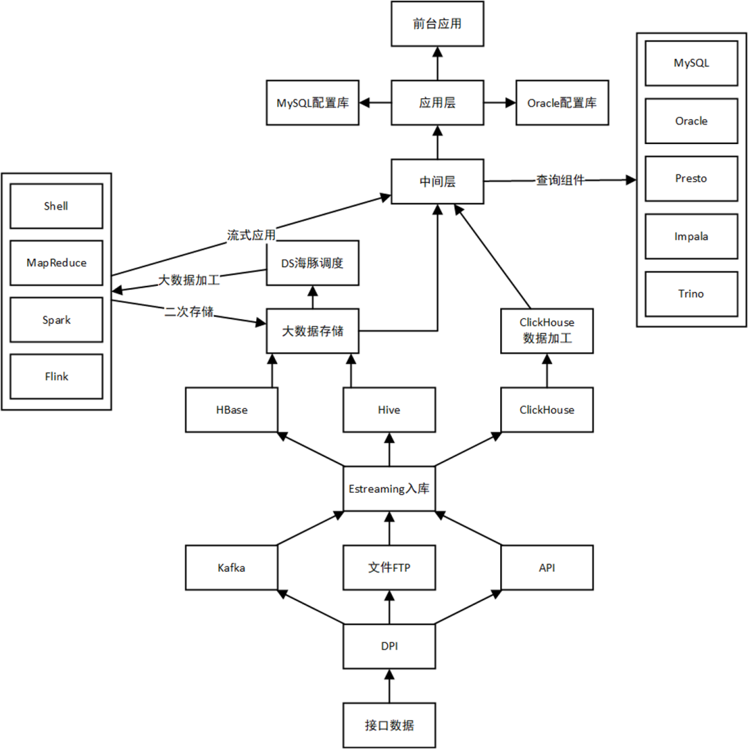 数据流程:在数据仓库中进行加工,加工完成的数据放入CK,应用直接查询CK的数据