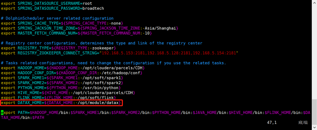 使用DataX需要在dolphinscheduler_env.sh文件中去指定datax的路径。