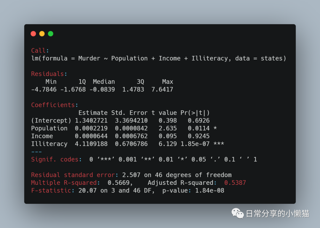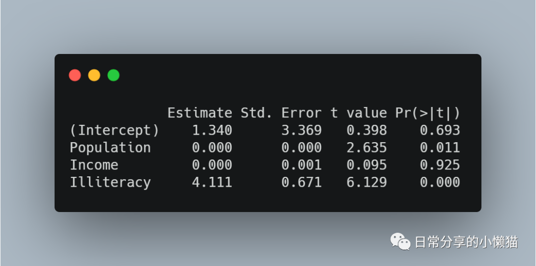 利用基础的summary() 函数,索引其coefficients,可以得到变量的具体回归系数