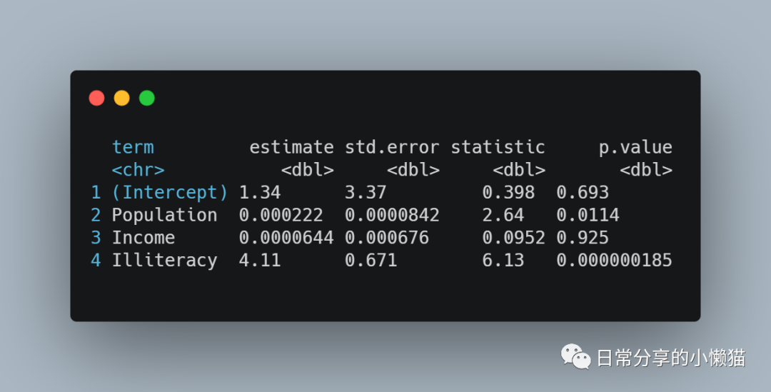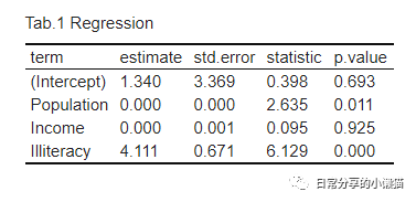 利用broom包中的tidy() 函数可将回归结果自动输出为tidy样式