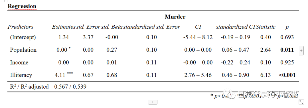 show.r2 = TRUE, p.style = "numeric_stars", show.obs = FALSE, title = "Regreesion")