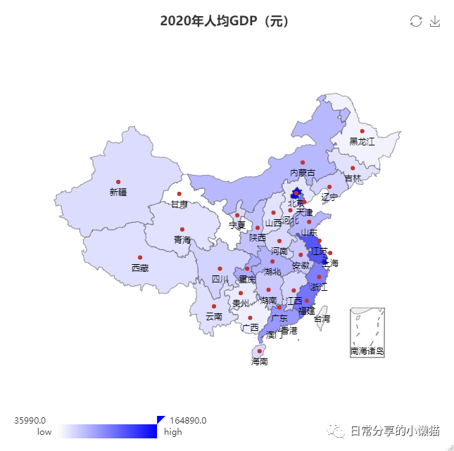 color = c("blue", "white"), legend = FALSE, title = "2020年人均GDP(元)")