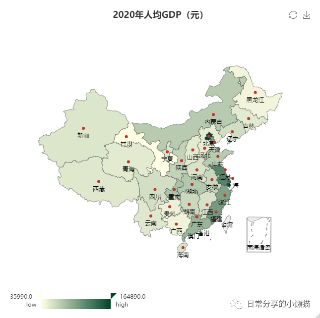 color = brewer.pal(9, "YlGn") %>% rev(), legend = FALSE, title = "2020年人均GDP(元)")