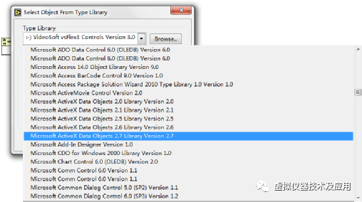 2)在弹出的对话框中通过图示操作寻找Microsoft ActiveX Data Objects 2.7 Library Version 2.7(注意,这里示例是2.7版本,建议有更高版本选择更高版本)。若找不到对应组件,则点击“Browse…”按钮,通过地址C:\Program Files (x86)\Common Files\System\ado寻找引入msado15.dll、msado28.tlb、msado27.tlb、msado26.tlb、msado25.tlb、msado21.tlb、msado20.tlb中的任意一个文件,这7个文件分别对应ADO控件的7个版本,先列的版本最高,建议优先选择高版本的ADO控件;