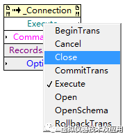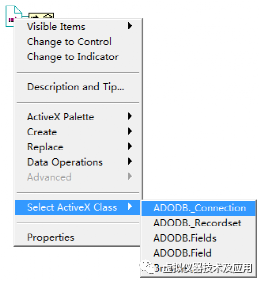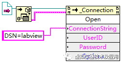 5) 在框图程序(Block Diagram)窗体中放置一个Automation Open节点(节点路径:All Functions-Communication-ActiveX-Automation Open),给其输入端口Automation Refnum创建一个Constant常量,右键点击该常量,选择其Class为ADODB._Connection。