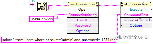 使用LabVIEW建立一个VI文件,命名为“删除记录.vi”。在该VI中实现功能:删除uses表中帐号(account)为“aaa”的记录(为了设计后的测试,要先在数据库手工添加1条帐号(account)为“aaa”的记录)。