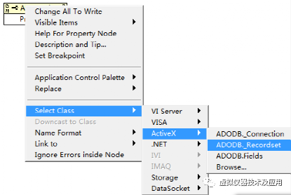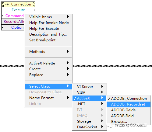 ①从现有程序中复制粘贴一个Invoke Node节点,右键点击该节点,将其类选择为“ADODB._Recordset”,如下图所示;