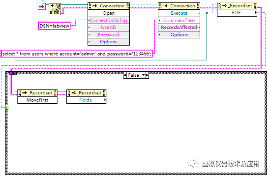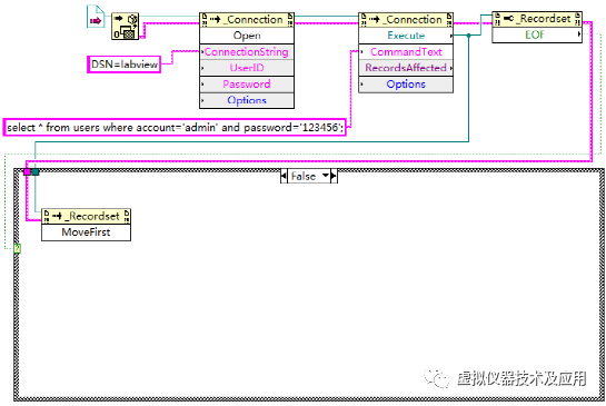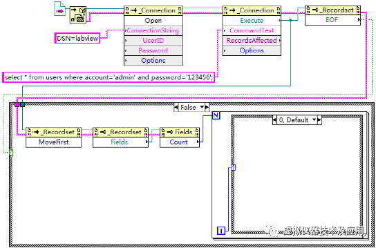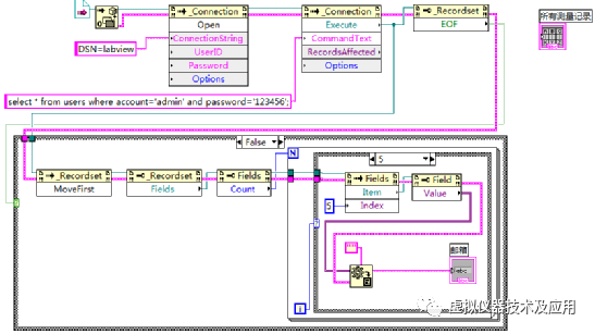 使用LabVIEW建立一个VI文件,命名为“读取指定的单条记录.vi”。在该VI中实现功能:判断用户表users中是否存在帐号为“admin”和密码为“123456”的记录,若存在,读出该条记录的所有信息并显示,若不存在,弹出对话框提示。