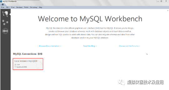 (2)下图为MySQL WorkBench启动后的界面,其已经自动创建了一个本机的MySQL Server连接,点击该连接即可连上该MySQL Server进行操作;
