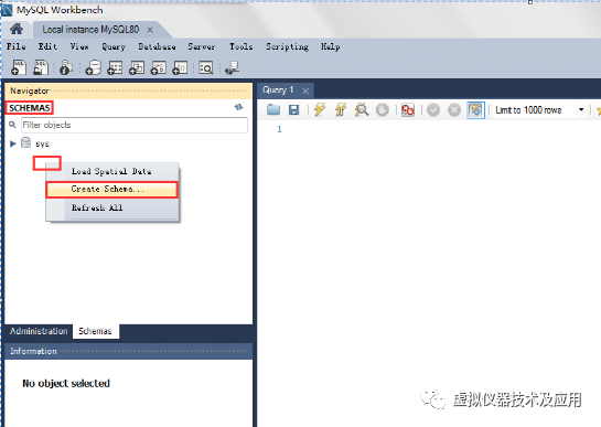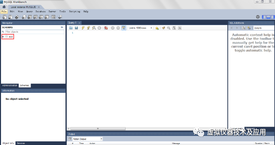 (3)下图为连上MySQL Server后的界面,可见该MySQL Server已经创建有一个名称为“sys”的数据库,这是MySQL Server自动创建的,用于存储MySQL Server的配置信息;