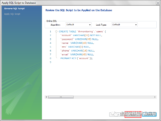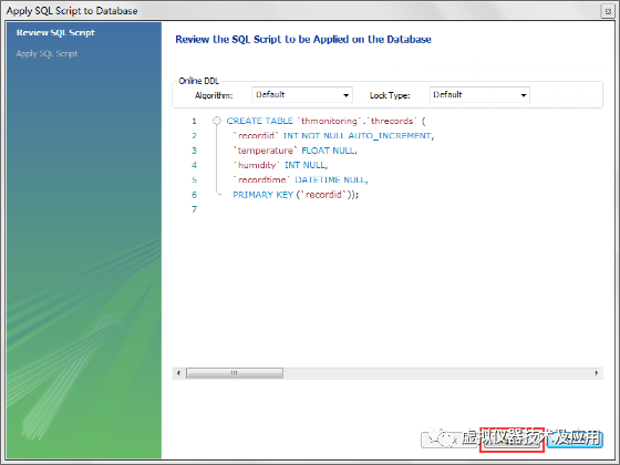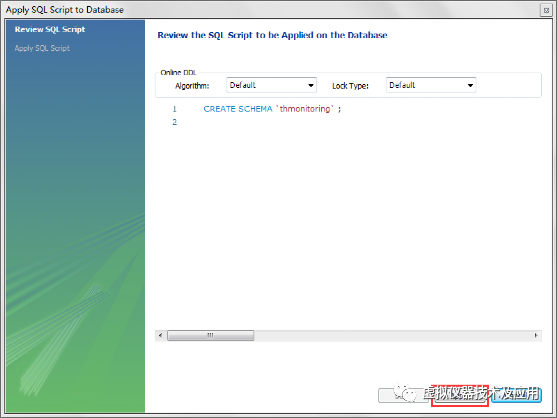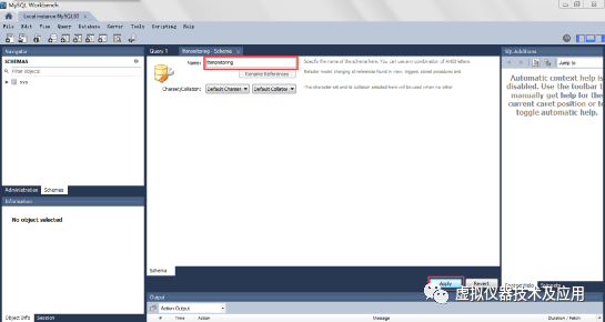 (2)在界面中间区域弹出的窗体的文本框中输入要创建的数据库名称,按课程设计的要求,这里输入“thmonitoring”,然后点击右下角的“Apply”按钮创建数据库;