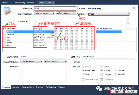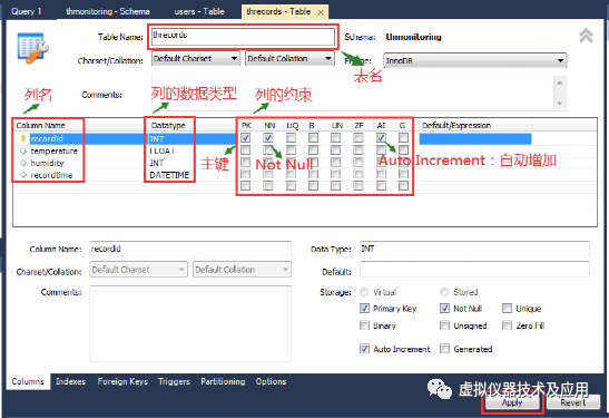 2)在界面中间弹出的窗体中按课程设计的要求输入表名、列名,确定各列的数据类型和约束,然后点击“Apply”按钮;