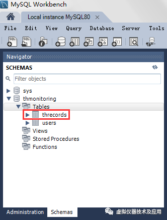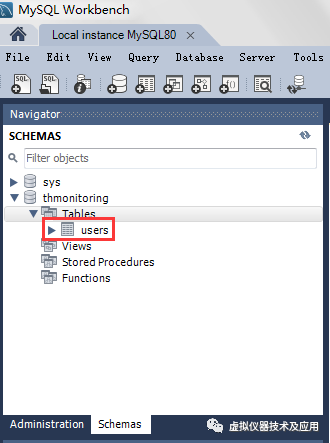 (5)可发现在左上角的SCHEMAS窗体中已经增加了刚才创建的名称为“thmonitoring”的数据库。