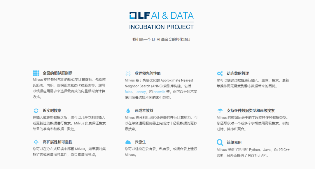 Milvus 是一款开源的特征向量相似度搜索引擎Milvus 使用方便、实用可靠、易于扩展、稳定高效和搜索迅速。