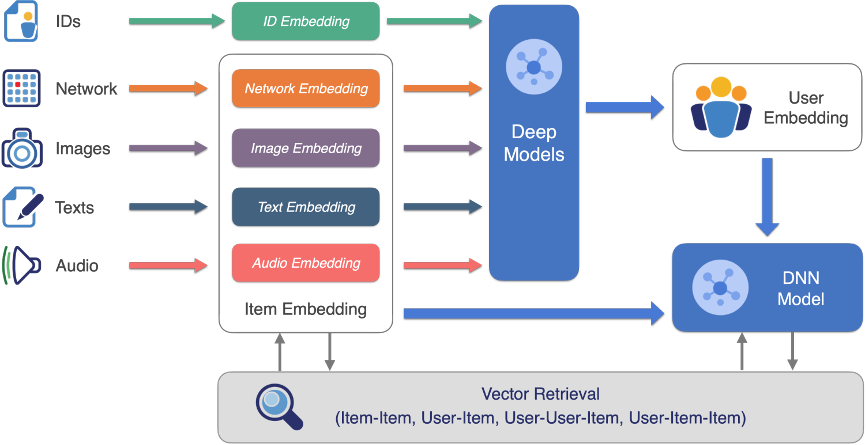 新一代的搜索推荐系统吸纳了深度学习的 Embedding 的能力, 通过诸如 Item-Item (i2i)、User-Item (u2i)、User-User-Item (u2u2i)、User2Item2Item (u2i2i) 等向量召回的方式实现快速检索。