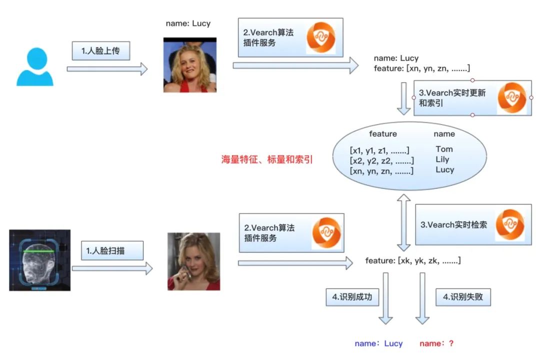 以图片搜索为例,我们先以离线的方式对所有历史图片进行机器学习分析,将每一幅图片(或者图片里分割出来的人物)抽象成高维向量特征,然后将所有特征构建成高效的向量索引,当一个新查询(图片)来的时候,我们用同样的机器学习方法对其进行分析并产出一个表征向量,然后用这个向量在之前构建的向量索引中查找出最相似的结果,这样就完成了一次以图片内容为基础的图像检索。