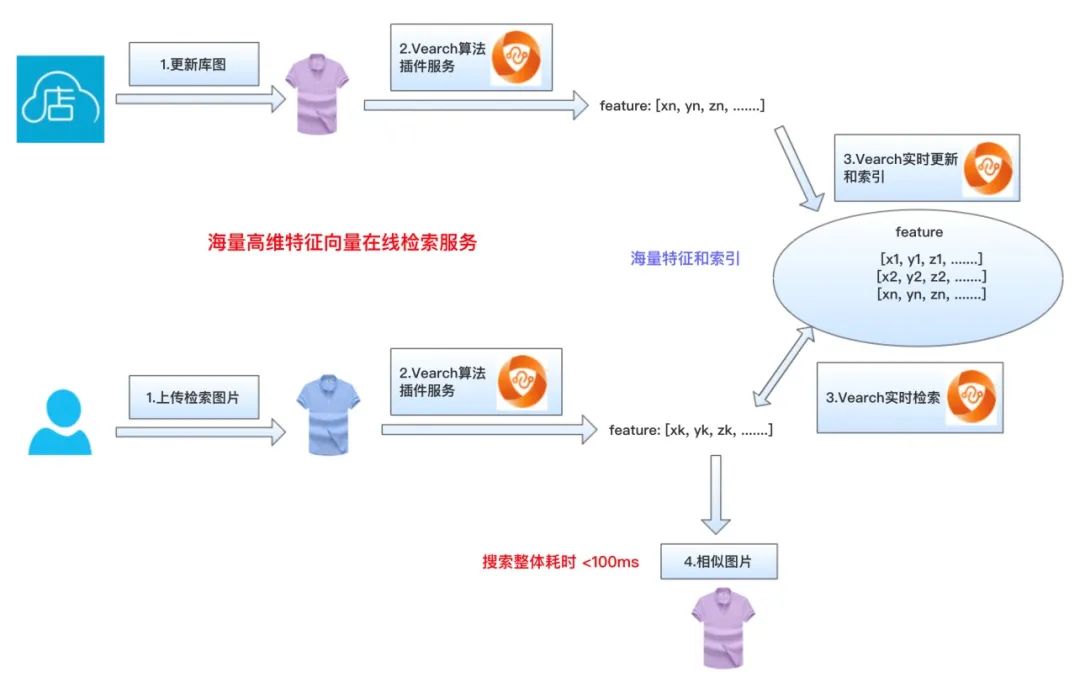 案例 2:vearch 可提供实时在线相似性图片搜索服务,比如在电商平台可以用来搜同款。详细流程如图 7 所示: