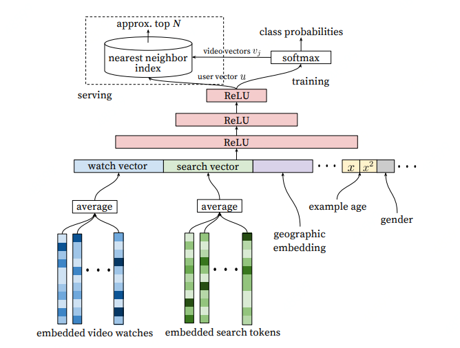 案例 4:可应用于搜索,推荐系统。比如视频网站推荐系统将各种特征 embedding 成向量后,利用向量相似性检索做召回,召回模型细节如图 9 所示: