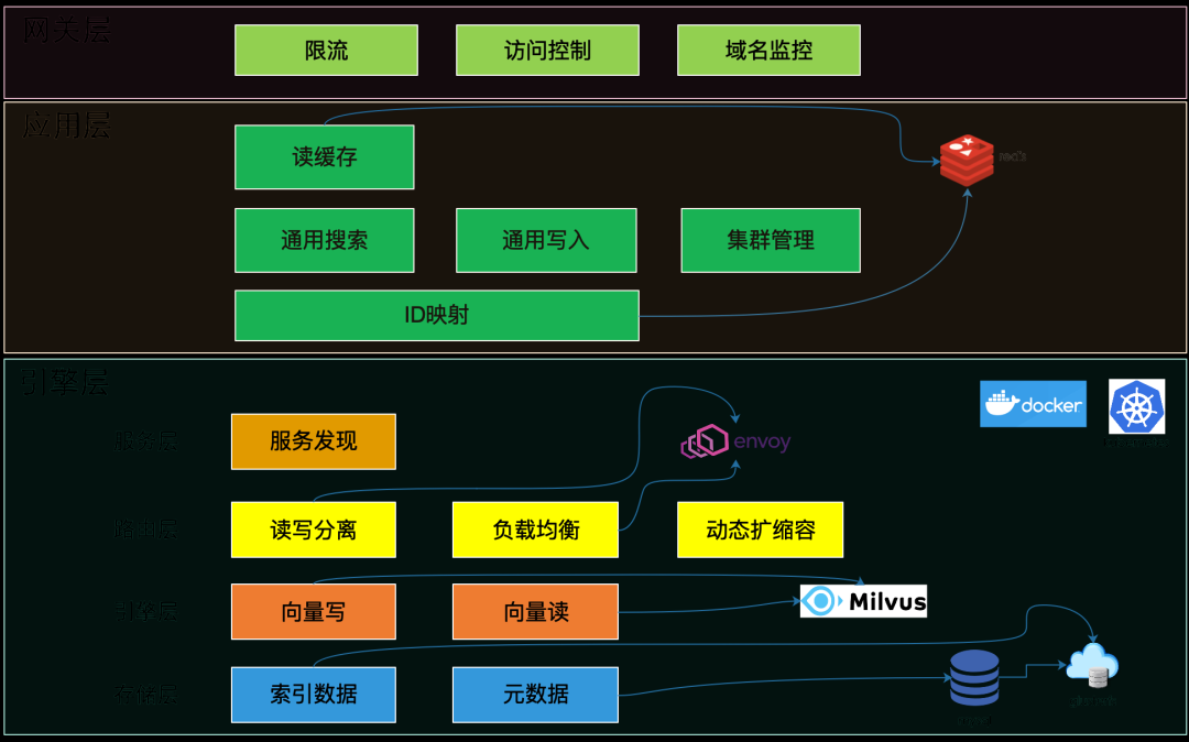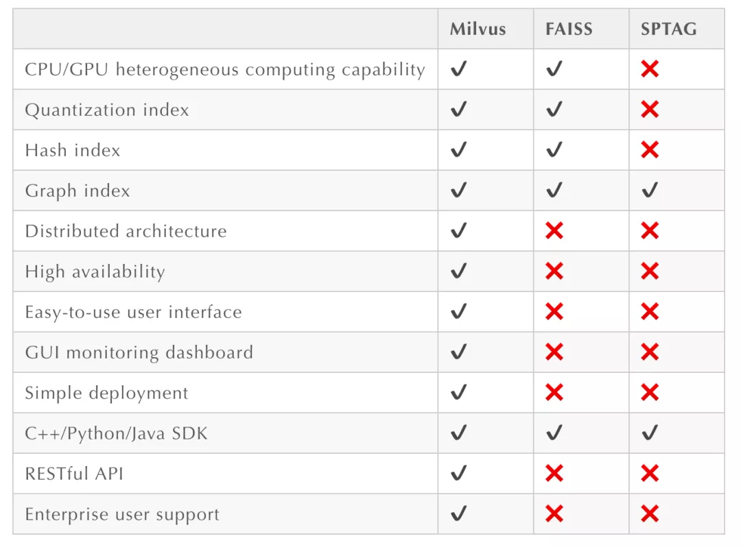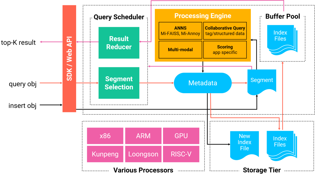 Milvus基于Faiss、Annoy等比较成熟的开源库,并针对性做了定制,支持结构化查询、多模查询等业界比较急需的功能;Milvus支持cpu、gpu、arm等多种类型的处理器;同时使用mysql存储元数据,并且在共享存储的支持下,Milvus可以支持分布式部署。