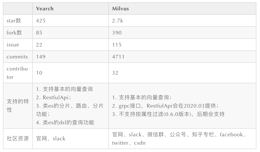 另外,Milvus对比Vearch,在社区活跃度、支持度上具有更明显的优势。基于以上的调研,综合考虑各方面的成本,我们选择Milvus作为底层引擎。