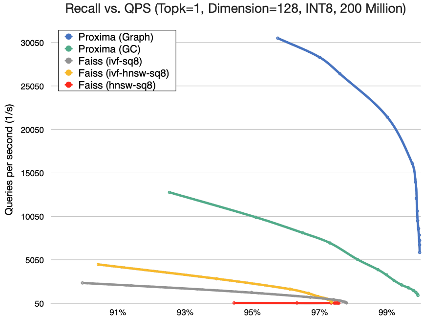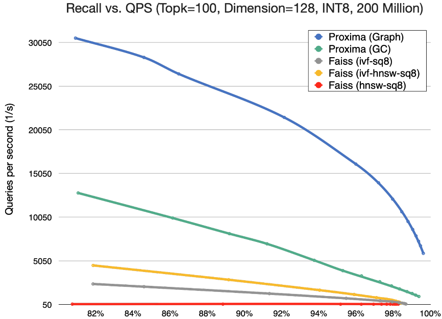 Proxima 的检索性能优于 Faiss 数倍,并且能实现更高精度的召回,针对 TOP1 的检索更是技胜一筹。除此,Faiss 在一些算法实现上也存在设计缺陷,例如 HNSW 的实现,针对大规模索引,检索性能非常低。
