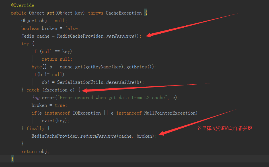 通过对问题的假设,我们需要在程序中找到从jedis pool中获取资源的代码,那首先需要找到初始化连接池的地方,j2Cache里是通过RedisCacheProvider来维护jedis pool的。下面是j2Cache里通过jedis pool的连接操作redis的代码,可以看到,非常规范,通过try,catch,finally将资源操作包起来了,并且在finally中释放了资源,保证资源一定会被释放