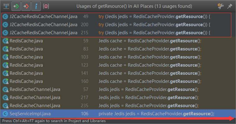 红薯表示这个锅我不背,肯定不是j2Cache的毛病了。可以看到RedisCacheProvider初始化连接池后,提供了一个静态方法getResource()用于获取连接,很可能是业务层面通过这个入口,拿到RedisCacheProvider里的连接了。后面继续找,定位到了一个非常有嫌疑的方法,代码如下: