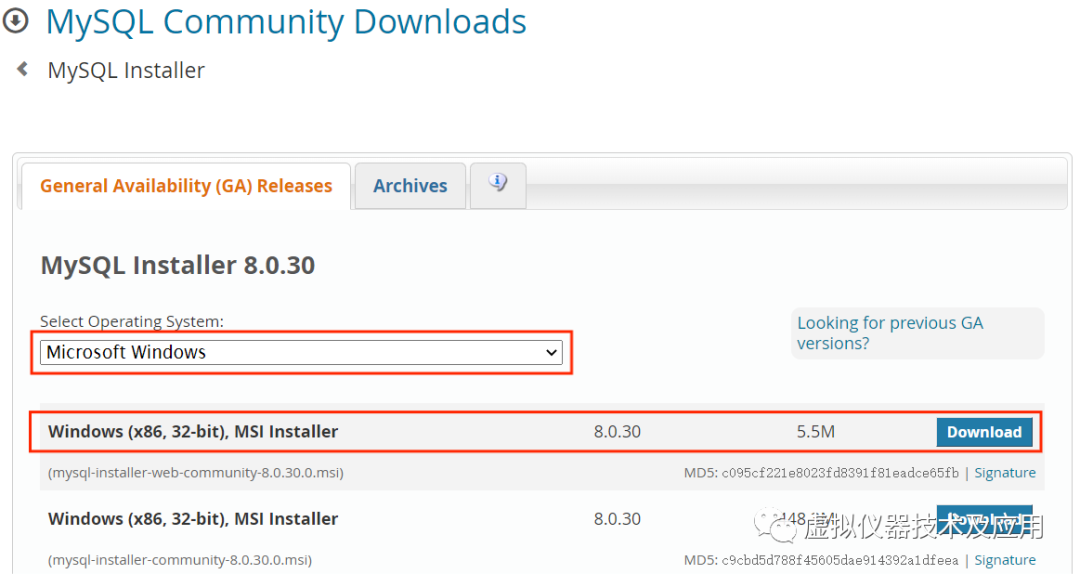 (1)在浏览器中输入下载地址“https://dev.mysql.com/downloads/installer/”打开下载页面。在打开的页面中操作系统选择“Microsoft Windows”,下载文件选择“Windows (x86, 32-bit), MSI Installer”,然后点击“Download”;