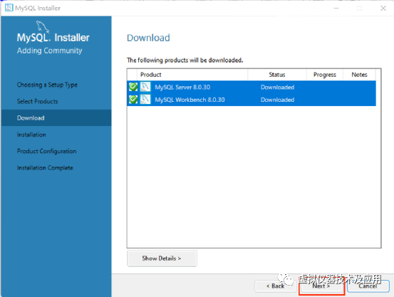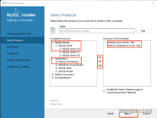 (2)从左边选择MySQL Server、MySQL Workbench两个产品进行安装,中间的箭头用于产品的选择和去除。其中MySQL Server为MySQL数据库服务器,为真正物理存储数据的地方;MySQL Workbench为MySQL数据库服务器的客户端软件,其可配置连接各个MySQL Server后操作里面的数据。然后点击“Next”进入下一步;