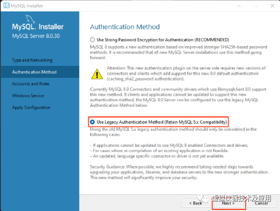 (7)在弹出的窗体中选择“Use Legacy Authentication Method(Retain MySQL 5.x Compatibility)”,以保持其他程序对MySQL数据库访问的兼容性(防止其他程序不可用),未选择的选项为使用强密码,其可以加强MySQL数据库的安全性。然后点击“Next”进入下一步;