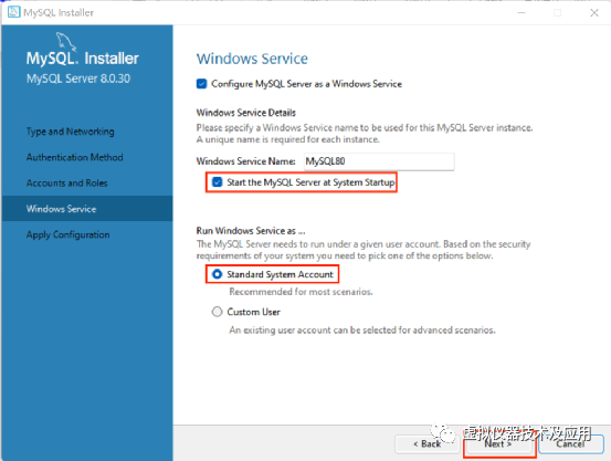 (9)在弹出的窗体中勾选“Start the MySQL Server at System Startup”(即操作系统启动时开启MySQL数据库服务器)和选择“Standard System Account”。然后点击“Next”进入下一步;