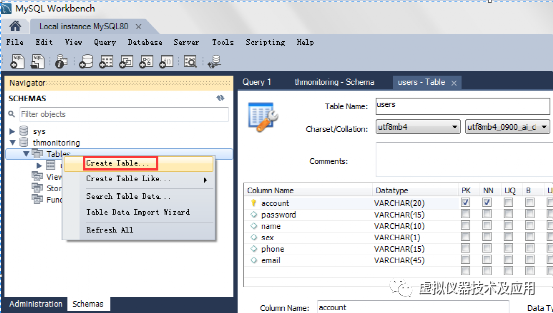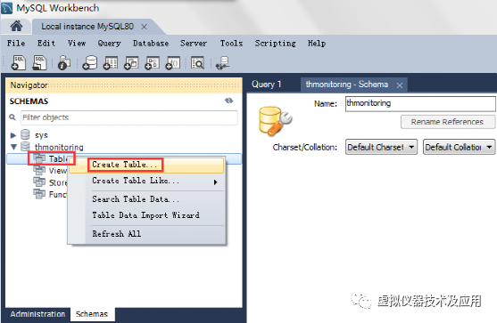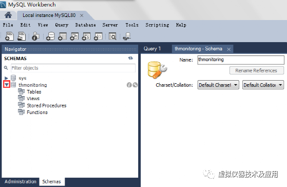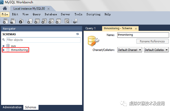 (5)可发现在左上角的SCHEMAS窗体中已经增加了刚才创建的名称为“thmonitoring”的数据库。