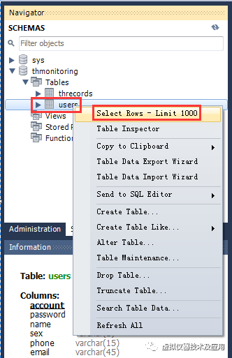 1)右键点击表格“users”,在弹出的菜单中选择“Select Rows – Limit 1000”;