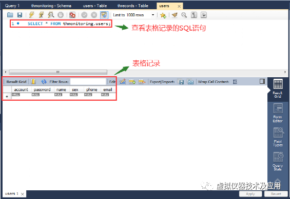 (2)在数据库中建立2个表格。第1个表格命名为“users”,用于存储用户信息,其包含“account、password、name、sex、phone、email”6个字段,分别用于存储“用户名、密码、姓名、性别、手机、Email”信息,各个字段的数据类型和约束按实际情况设计,并添加一些记录到这个表。第2个表格命名为“threcords”,用于存储温湿度记录,其包含“recordid、temperature、humidity、recordtime”4个字段,分别用于存储“记录编号、温度、湿度、测量时间”信息,各个字段的数据类型和约束按实际情况设计,并添加一些记录到这个表。