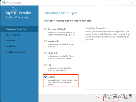 (1)运行上面下载的MySQL安装文件,在弹出的窗体中选择“Custom”,即选择“自定义安装”,然后点击“Next”进入下一步;