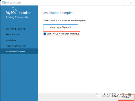 (12)在此处弹出的窗体中默认勾选了“Start MySQL Workbench after setup”,即安装完成后启动MySQL数据库服务器的客户端软件MySQL Workbench。可去掉该勾选,如果勾选了,将会在关闭安装窗体后打开MySQL Workbench。有关MySQL Workbench的使用将在后面的推文中进行详细介绍。最后点击“Finish”完成MySQL的安装。