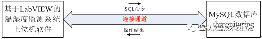 若“基于LabVIEW的温湿度监测系统上位机软件”要操作“MySQL数据库thmonitoring”,则很明显需要在它们之间建立连接通道。这个连接通道有两个作用:一是使“基于LabVIEW的温湿度监测系统上位机软件”可以发送“SQL命令”给“MySQL数据库thmonitoring”所在的MySQL Server;二是MySQL Server收到“基于LabVIEW的温湿度监测系统上位机软件”的SQL命令后,将对数据库thmonitoring 的“操作结果”通过该通道返回给“基于LabVIEW的温湿度监测系统上位机软件”。如下图所示: