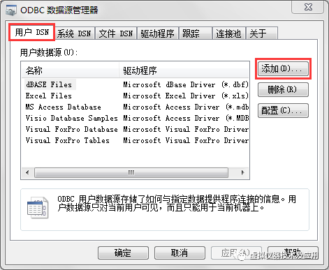 ①打开C:\Windows\SysWOW64文件夹下面的odbcad32.exe程序,在弹出的界面中选择“用户DSN”选项页,然后点击“添加”按钮,如下图所示。选择“系统DSN”选项页来建立也是可以的,“系统DSN”表示此操作系统的所有用户可用数据源,而“用户DSN”表示只有当前操作系统的登录用户可用数据源。