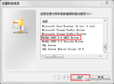 ②在弹出的窗体中选择“MySQL ODBC 8.0 ANSI Driver”,然后点击“完成”;