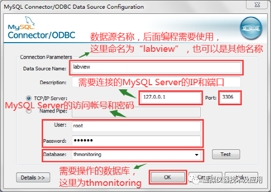 我们通过ODBC的方式建立“基于LabVIEW的温湿度监测系统上位机软件”和“MySQL数据库thmonitoring”之间的连接通道。ODBC(Open Database Connectivity,开放数据库互连)是微软公司Windows开放服务结构(WOSA,Windows Open Services Architecture)中有关数据库的一个组成部分,它建立了一组规范,并提供了一组对数据库访问的标准API(Application Programming Interface,应用程序编程接口)。