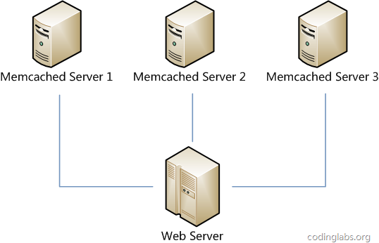 假设我们有一个网站,最近发现随着流量增加,服务器压力越来越大,之前直接读写数据库的方式不太给力了,于是我们想引入Memcached作为缓存机制。现在我们一共有三台机器可以作为Memcached服务器,如下图所示。