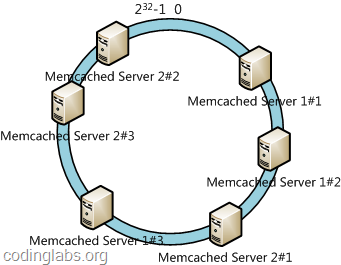 具体做法可以在服务器ip或主机名的后面增加编号来实现。例如上面的情况,我们决定为每台服务器计算三个虚拟节点,于是可以分别计算“Memcached Server 1#1”、“Memcached Server 1#2”、“Memcached Server 1#3”、“Memcached Server 2#1”、“Memcached Server 2#2”、“Memcached Server 2#3”的哈希值,于是形成六个虚拟节点: