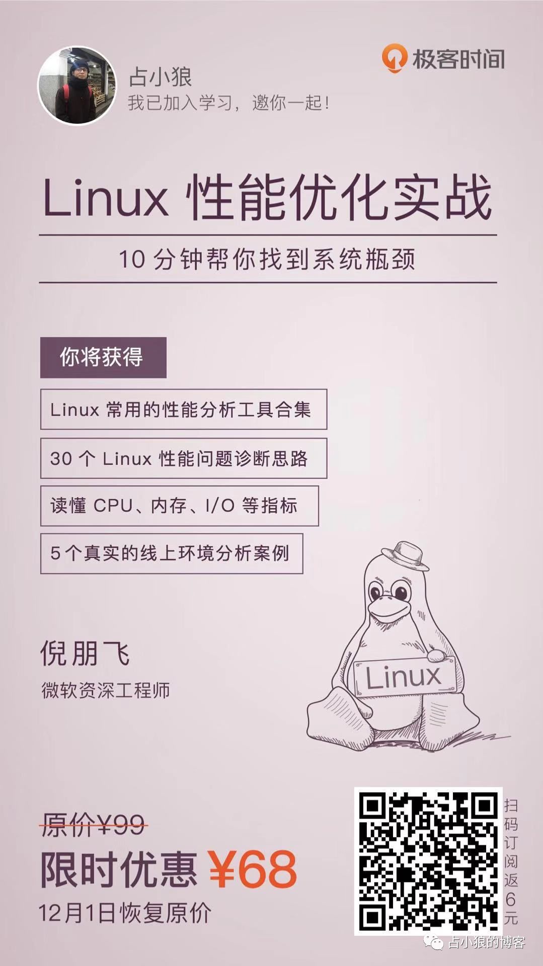 限时优惠价¥68,原价¥99,扫描我的海报订阅,还可返现6元,相当于只要62元,12月1日恢复原价。(提现方式:打开极客时间app,点击 我的-分享有赏)