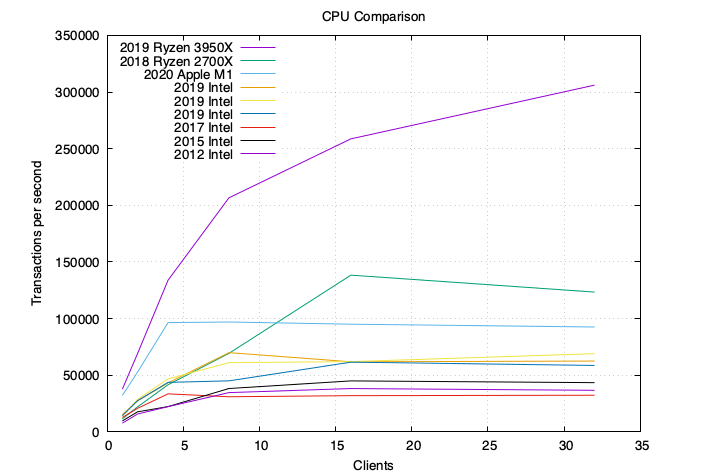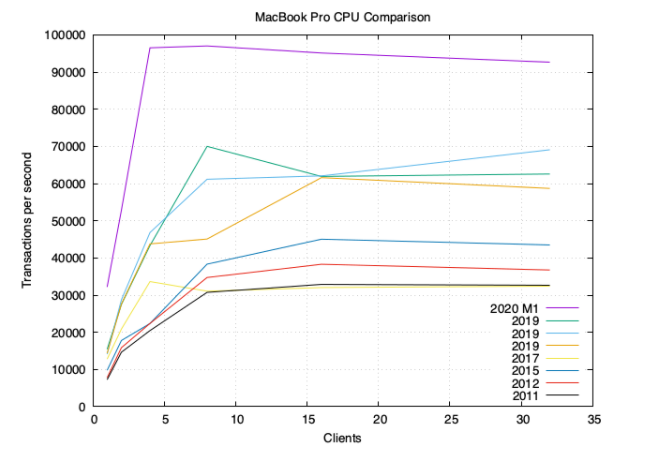我需要为我的基准测试工具包添加一些额外的软件,我看到的唯一编译问题是Qt和Python的numpy; 这两个问题发现后,似乎很容易解决。我上一篇博客介绍了我使用pgbench工具的基本方法,来评测过去MacBook Pro机型。我说过苹果需要在PostgreSQL上的性能结果超过“1.5万TPS单核心/6万TPS全部核心”,才能让英特尔彻底难堪。好吧,他们的表现超出了预期: