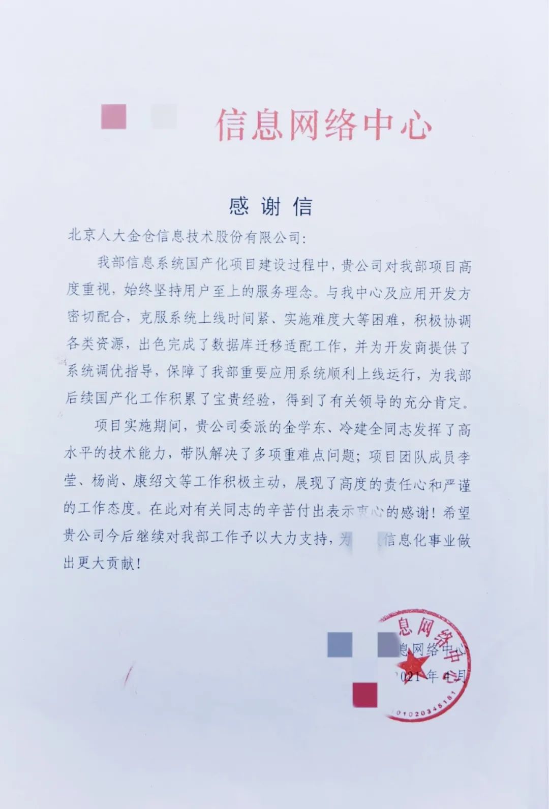 信中指出,人大金仓在该部委办公系统国产化项目建设过程中,对项目高度重视,始终坚持用户至上的服务理念,在时间紧任务重的情况下,出色完成客户重要应用系统的顺利上线。该部委对人大金仓在项目中所作贡献,以及项目实施人员良好精神风貌、高度的责任心、纯熟的技术水平给予了充分肯定,并致以衷心感谢!