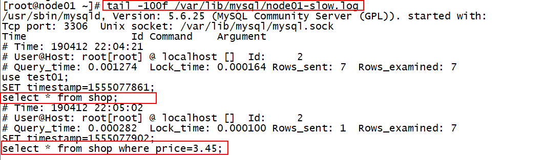 监听日志文件,看是否写入 : 注意 后面的日志文件的路径需要通过查询slow_query_log_file