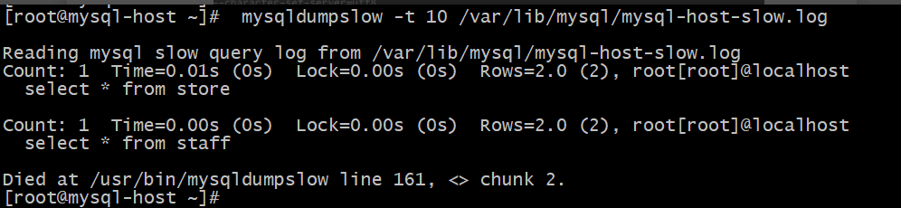 mysqldumpslow -t 10 /var/lib/mysql/mysql-slow.log : 查看慢查询日志的前10个分析结果