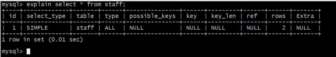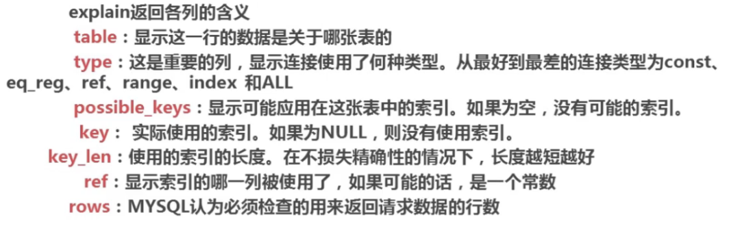 explain : SQL的执行计划侧面反映出了SQL的执行效率,具体执行方式只需要在执行的SQL前面加上explain关键词即可。