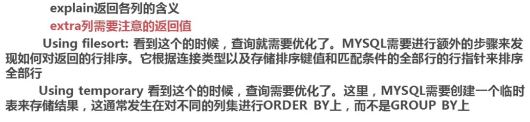D:using filesort:排序时无法使用到索引时,就会出现这个。常见于order by和group by语句中