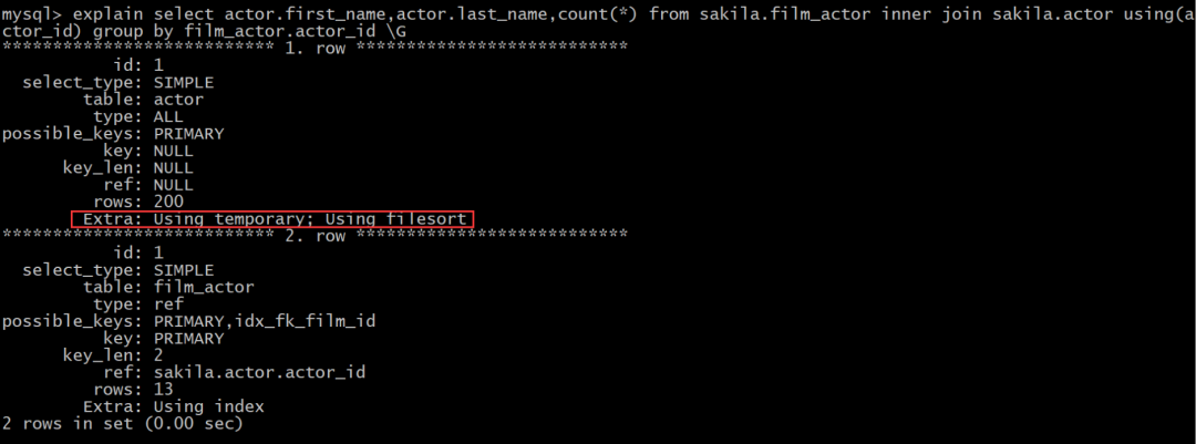 explain select actor.first_name,actor.last_name,c.cnt from sakila.actor inner join ( select actor_id,count(*) as cnt from sakila.film_actor group by actor_id) as c using(actor_id);